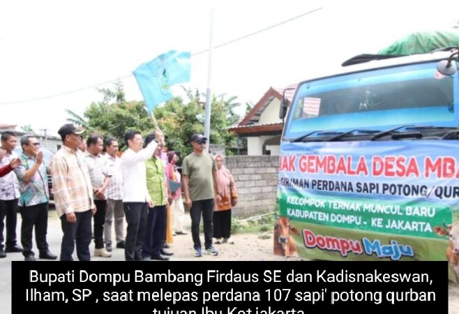 Dompu, NTB, Tintaupdat.com – Bupati Dompu Bambang Firdaus, SE di dampingi Kadisnakeswan Dompu, Ilham, SP beserta Jajarannya melepas perdana 107 Ekor Sapi potong qurban milik petani ternak Desa Mbawi.